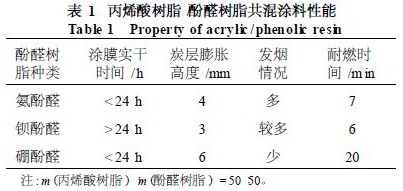 2結果與討論 211酚醛樹脂種類對涂料性能的影響 分別考察了氨酚醛、鋇酚醛及硼酚醛樹脂3種常用酚醛樹脂與丙烯酸樹脂共混涂料的防火性能和理化性能,實驗結果見表1。
