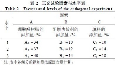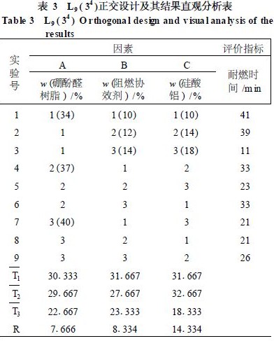 表1 丙烯酸樹脂 酚醛樹脂實驗涂料性能 從表1看出,3種酚醛樹脂中,以硼酚醛樹脂與丙烯酸樹脂的拼用效果最好,其耐燃時間明顯長于其他2種共混涂料,且成膜性能良好,發(fā)煙量少,炭層膨脹明顯,是防火涂料樹脂基料的理想選擇。 212正交試驗設計及結果 本試驗選擇涂料的耐燃時間作為評價指標,指標值越大防火性能越好。同時,正確選擇因素和水平是試驗成功的關鍵,根據(jù)前期預備實驗的結果,分別以硼酚醛樹脂、阻燃協(xié)效劑和填料在防火涂料體系中的添加量作為3個因素,每個因素取3個水平,得到因素與水平表(表2)。