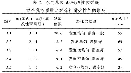 表1 超薄型鋼結(jié)構(gòu)防火涂料的基本配方 1.3涂層的制備 用500,1000號砂紙分別將80mm×80mm×1mm的Q235鋼片打磨至光亮,用3%KFD-1000金屬清洗劑溶液于80℃清洗30min后取出,烘干,備用。將防火涂料充分?jǐn)嚢韬?用毛刷涂覆在Q235鋼片的打磨面上,每次涂覆0.3~0.5mm,保持表面均勻光滑,待涂層表干后涂覆下一次,控制最終涂膜厚度不超過3mm,涂覆比約為0.15kg/m2。將涂好的試片平置,放入烘箱(25℃)內(nèi)干燥。 1.4耐火性能測試 采用垂直燃燒方法進行簡易評價[4],這也是防火涂料研究的通用方法。 2結(jié)果與討論 2.1基料配比對耐火時間的影響 2.1.1乳液復(fù)配比例苯丙乳液做基料膨脹發(fā)泡好,但結(jié)構(gòu)疏松,空氣對流強時易吹落;環(huán)氧改性丙烯酸乳液做基料,附著力優(yōu)異,結(jié)構(gòu)堅硬致密,但膨脹發(fā)泡高度不夠。將二者結(jié)合則能克服缺點,突出優(yōu)點。表2表明,苯丙乳液與環(huán)氧改性丙烯酸乳液用量質(zhì)量比為2∶1時,涂料的耐火時間最長,發(fā)泡好,炭層堅硬致密。