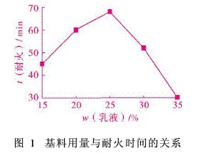 表2 不同苯丙/環(huán)氧改性丙烯酸混合乳液質(zhì)量比對涂料耐火性能的影響 2.1.2基料樹脂用量 由圖1可見,基料樹脂用量對防火涂料的耐火性能有很大影響:樹脂用量(質(zhì)量分?jǐn)?shù))為15%~25%時,耐火時間延長;繼續(xù)增加用量,耐火時間反而縮短。其原因是樹脂用量少,不能起到和基材粘結(jié)的作用,形成的炭質(zhì)層容易脫落;樹脂用量過多時,膨脹阻燃體系含量減少,不能形成很好的炭質(zhì)層。因此,適量的基料樹脂能保證很好的耐火性能。基料最佳用量為25%。